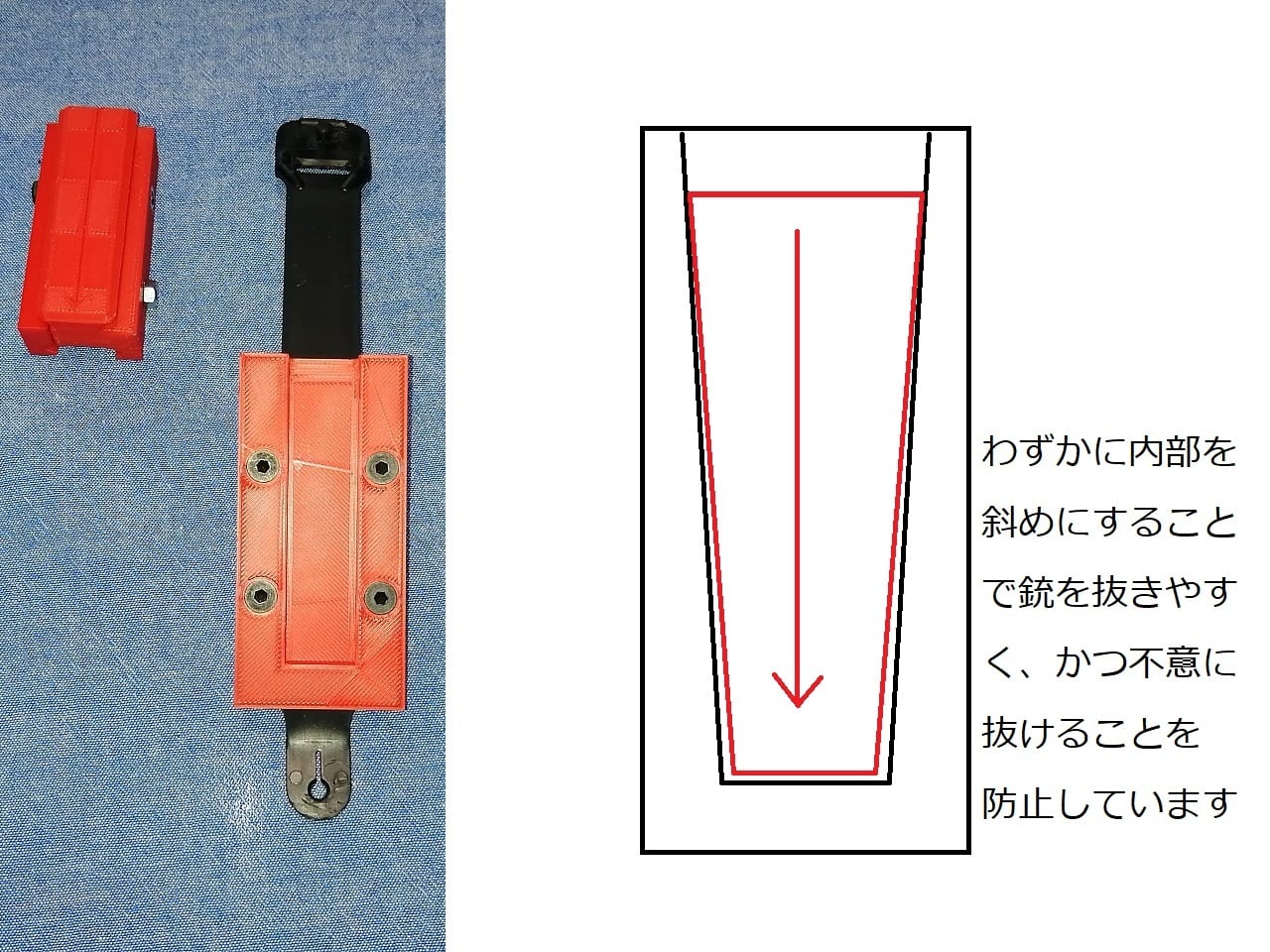 内部をわずかにテーパー形状にすることで歩行等の振動でしっかりと固定され、銃を不意に落とすということがなく、また抜くときもわずかな力で抜くことが出来ます。